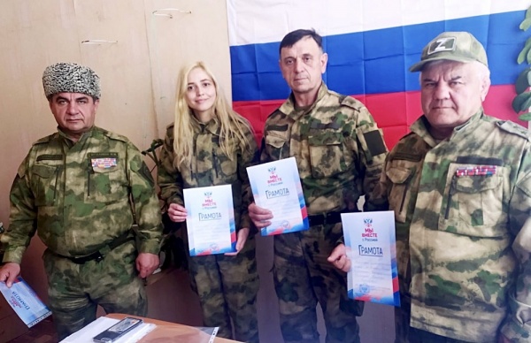 Зам главы Военно-городской администрации - Провандовская Вита Леонидовна, начальник пресс-центра Арман Людмила Анатольевна, волонтер Щепащенко Нина Сергеевна, начштаба города Токмак «Мы вместе с Россией» Куц Андрей Владимирович.